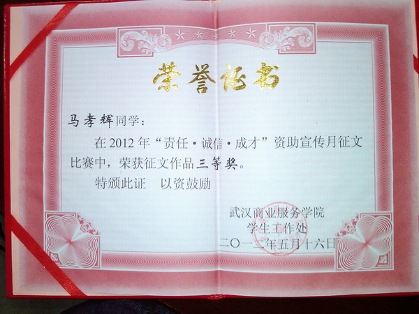 2010年,我如愿收到了大学的通知书,我的家庭也因此赢来了幸福和温馨。而苦脑也由然而来那将近5位数的学费,给予我这个贫困的家庭巨大的压力,如果我选择外出打工,那么我就可以为我的家庭减少了负担,减少了一大笔的经济开支。可我不甘心,不甘心自己梦想己久的大学就这样跟自己擦肩而过。而我的家人懂我的心思,他们坚决让我上大学,他们到亲戚家和朋友家里去借,再加上没日没夜工作所得的辛苦钱,终于筹够了我的学费,让我如愿踏上了武汉商业服务学院的大门,那一刻在心底萌发的感动是无法用言语表达出来的。