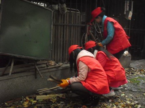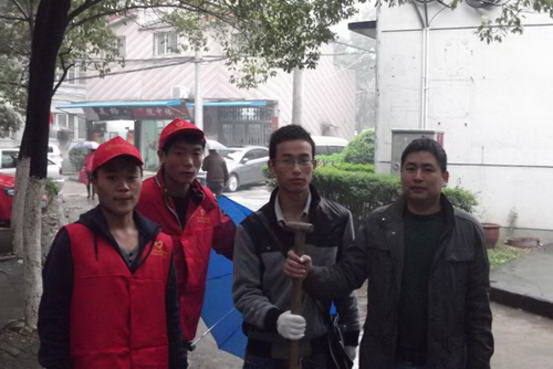 志愿者为空巢老人清理门口杂物