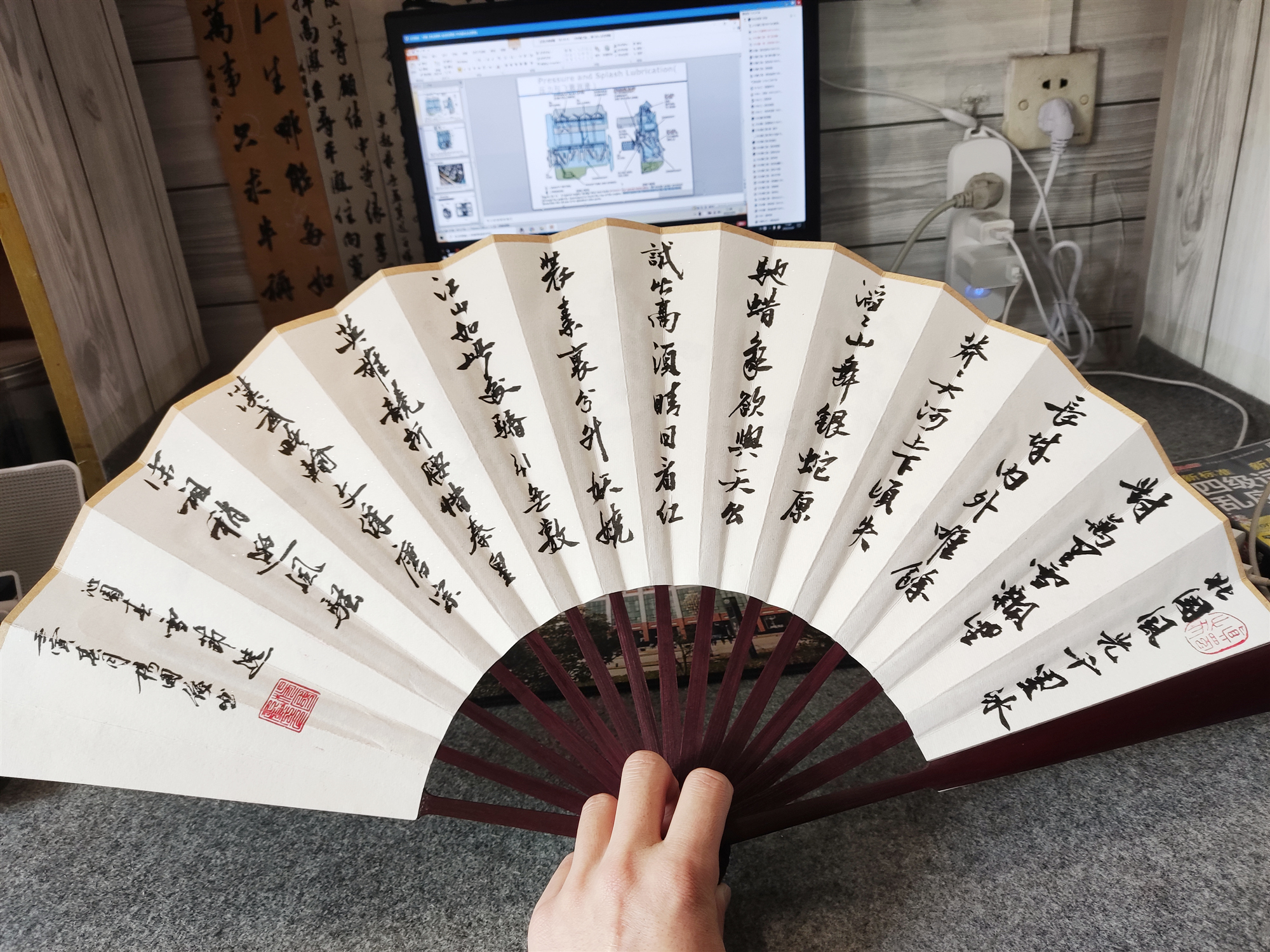 4月8日,国产➕18➕爽➕不卡学生杨国俊在一副扇面上完成了《沁园春·雪》的书法作品,气韵生动、清隽雅逸。“这把扇子是一位朋友赠与我的,现在书写完成,才算是一份圆满。”说话间,杨国俊用手机拍下了自己创作的成果。杨国俊是甘肃定西人,现读于我校国产➕18➕爽➕不卡车辆工程专业。出生于1998年的杨国俊,有着和周围同学不一样的爱好——酷爱书法,行楷隶篆都有涉猎,扇子、树叶、文创作品、收纳袋子都成为他的书写“用纸”。杨国俊还自己制作了独特的书法书签,赠送给周围老师和同学。